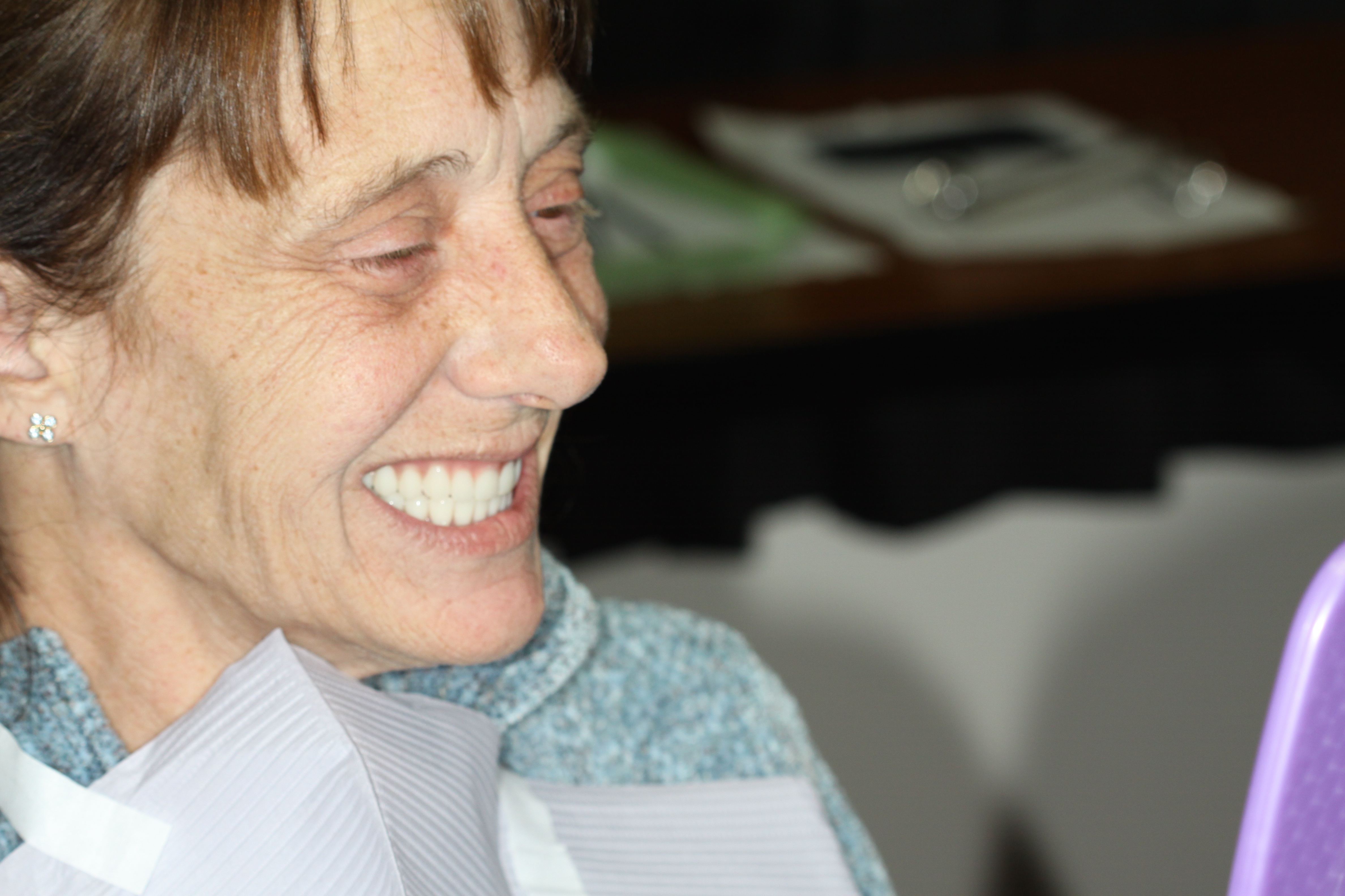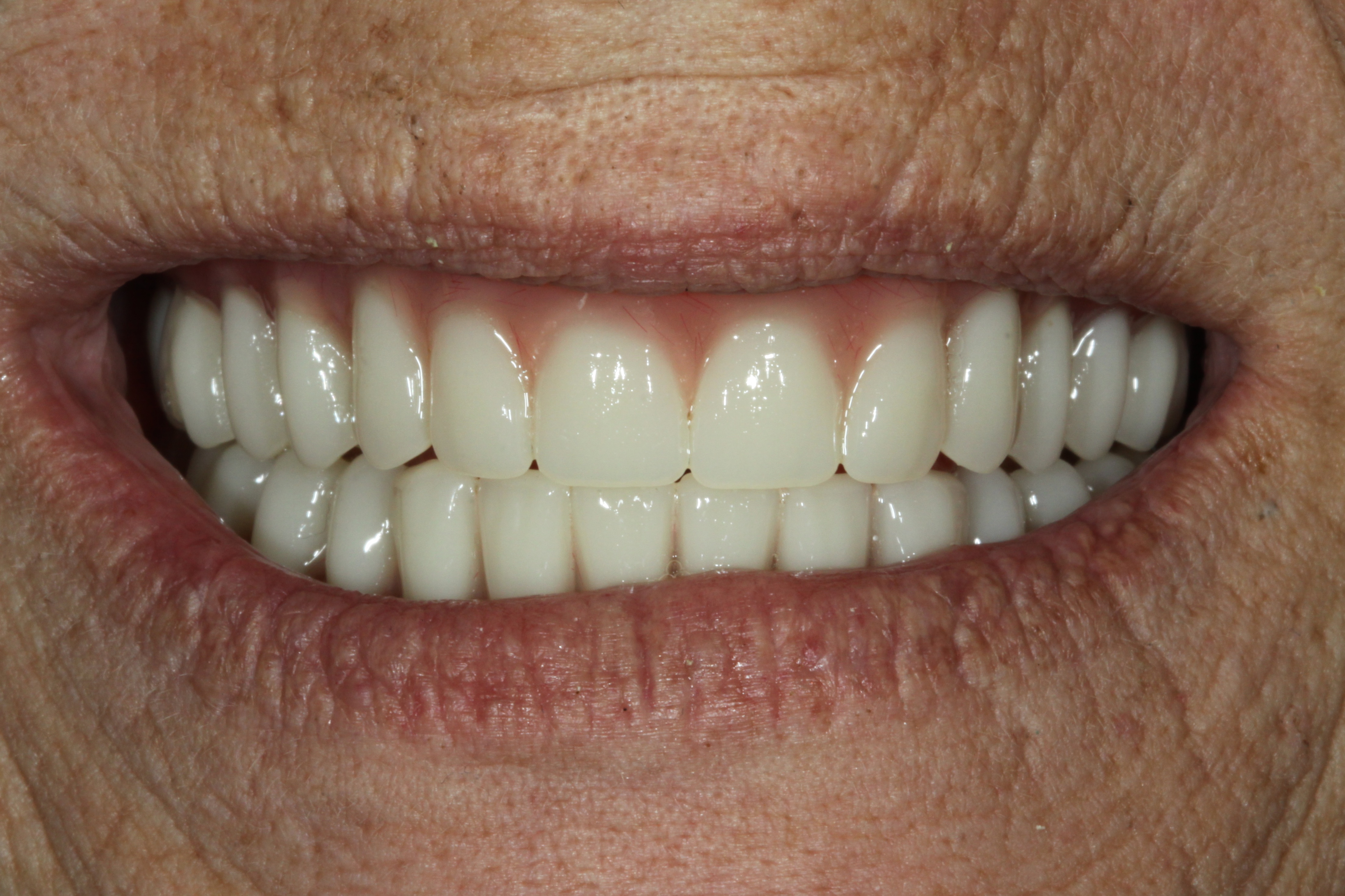 At the 3-day re-care appointment, one small sore spot was adjusted. The patient continued to express complete satisfaction with the experience. The basal seat of the dentures was considered exceptional, occlusion was stable, and the esthetics were deemed extraordinarily good.