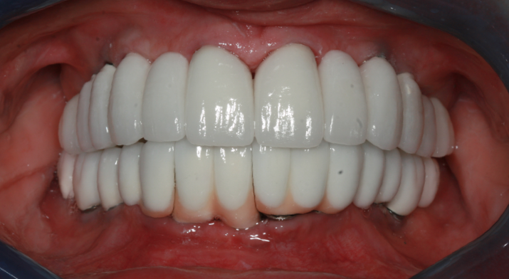There are a wide variety of such interdental products on the market. For implant patients, the author recommends choosing an oral irrigator that pulsates and has at least two tips: the universal tip and the dental implant tip with three tufts. A Tufts University School of Dental Medicine study found a water flosser with implant tip was 145% more effective than string floss around implants when used in conjunction with a manual toothbrush.9 Significant reduction of gingival bleeding at 2 weeks and 30 days, respectively, were reported.9 Improvement in the health of tissues around implants can be seen in one patient who presented with inflammation around an implant (Figure 1), and another patient with a full-arch prosthesis that now has minimal-to-no plaque around both the top and bottom peri-implant tissues (Figure 2).