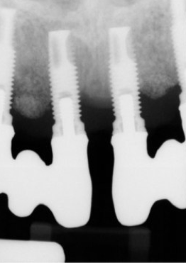 Given patient concerns about radiation exposure, it is important to know how, when, and why radiographs should be taken. Although there are concerns about radiation, radiographs make it possible to determine bone levels at baseline—ie, at implant and restoration insertion—and to monitor them over time. Vertical radiographs should be as parallel as possible to the implant body, so that the implant threads are clearly visible. Typically, periapicals should be taken once a year around dental implants. Figure 3 and Figure 4 shows bone loss up to the fifth and sixth thread.