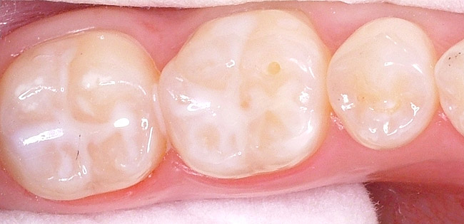 Deciding which teeth are at risk will vary from clinician to clinician and be based upon experience. A possible criterion that may be used is the determination of whether the tooth has deep occlusal pits and fissures. Some concern has been raised with regard to sealing over undiagnosed, incipient carious lesions on the occlusal surface. Research has shown that sealing active caries in pits and fissures from clinical and radiographic findings that there is no progression of the carious lesions.17-19 Therefore, based upon the evidence to date, placing sealants on at-risk teeth is a cost-effective technique while sealant placement over active or incipient carious lesions does not appear to be detrimental.