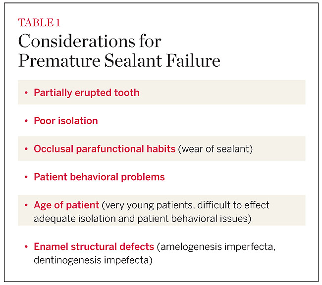 The studies show that sealants work if applied correctly. Sealant success is multifactorial.7,13 Technique, fissure morphology, and the characteristics of the sealant contribute to clinical success.14 When one reviews published sealant data, a basic concept of 5%–10% of sealant loss per year has been seen demonstrated.15 This data reveal the importance of reevaluating teeth with sealants on a periodic basis and to reapply if necessary. The one negative aspect of sealants in the realm of dental prevention would be the failure of clinicians to reevaluate and reapply sealants that are lost or failing. Failure to maintain sealants will lead to pits and fissures that were sealed becoming susceptible to bacterial invasion with the need for more invasive tooth preparations and restorations.15 Table 1 lists considerations to be evaluated for early sealant failure.