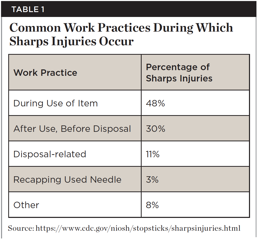 In addition to the use of sharps devices, injuries are also closely associated with certain work practices that can pose an increased risk of bloodborne pathogen exposure. Common work practices include disposal-related activities; activities after use and prior to disposal, such as item disassembly; and recapping a used needle (Table 1).7-9