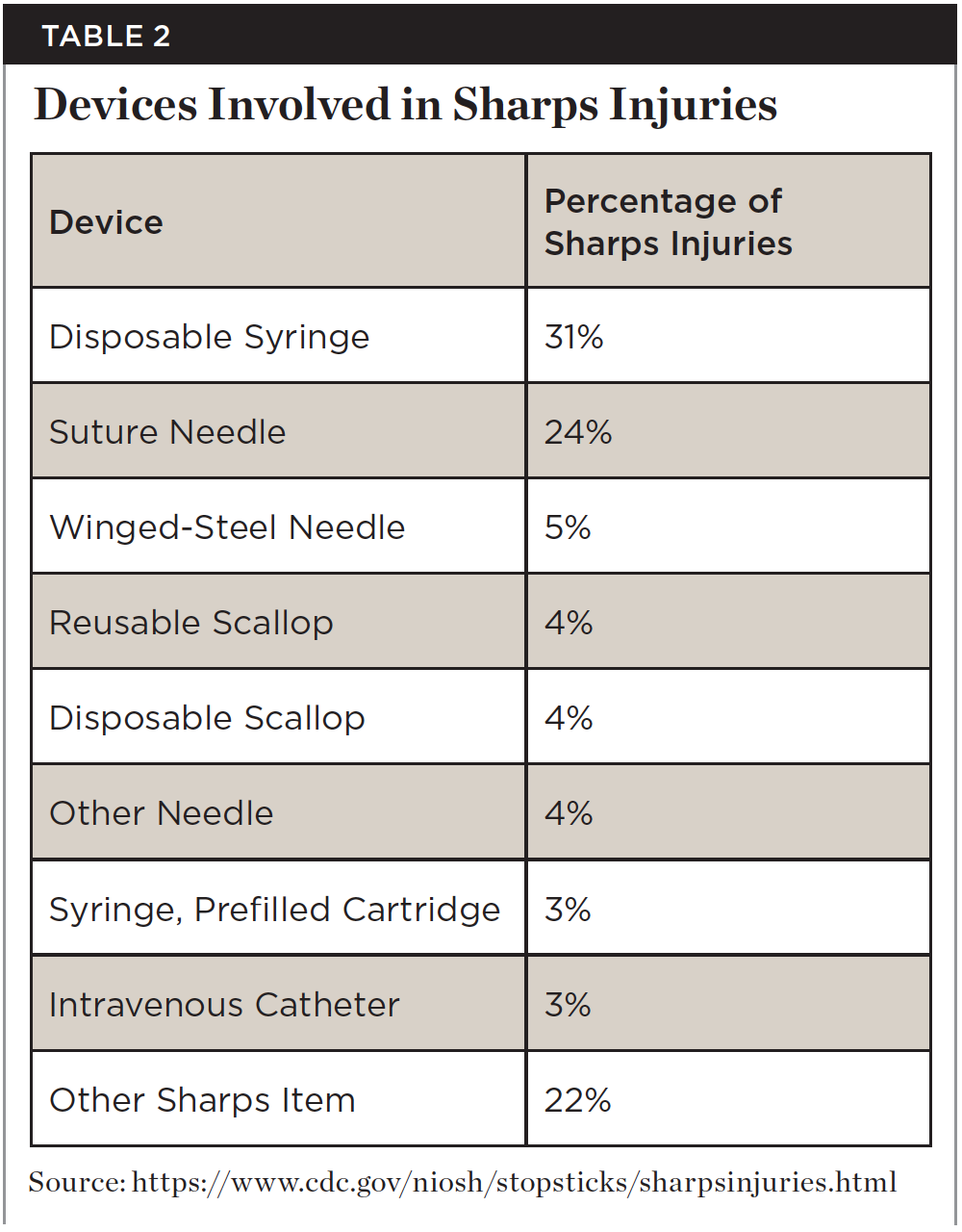 Also, injuries are closely associated with certain devices that can pose an increased risk of bloodborne pathogen exposure. These devices include disposable syringes, suture needles, and other types of sharps (Table 2).8,9
