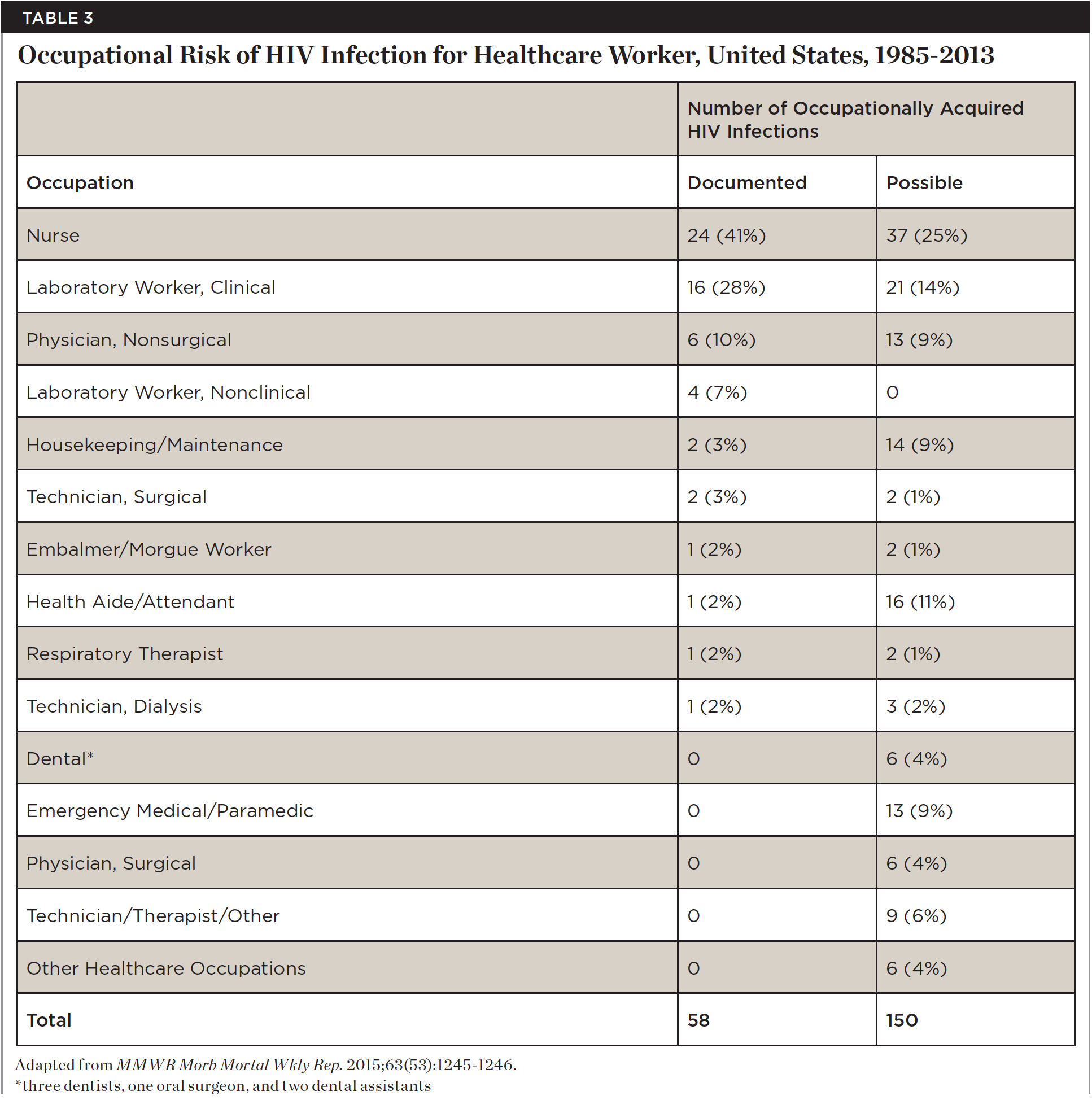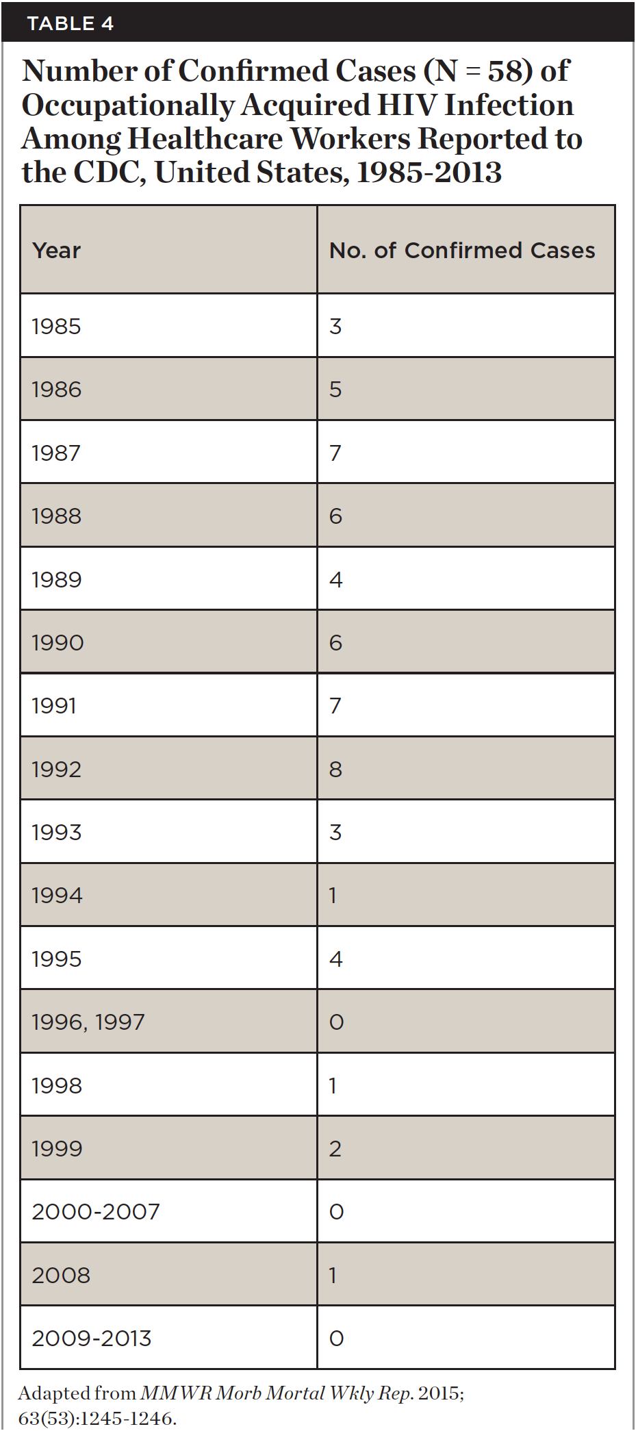 In the United States, 58 confirmed cases and 150 possible cases of occupationally acquired HIV infection were reported to the CDC between 1985 and 2013 (Table 3). Since 1999, however, only one confirmed case (a laboratory technician who sustained a needle puncture while working with a live HIV culture in 2008) has been reported (Table 4). Of course, underreporting is a possibility because reporting is voluntary.1,9,10